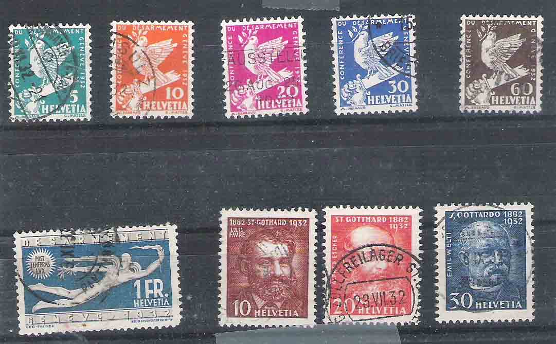 Swiss stamps, scott #210-218. Used, good condition. Louis Favre, Alfred Escher, Emil Welti. Geneve, Desarmement, St. Gotthard.